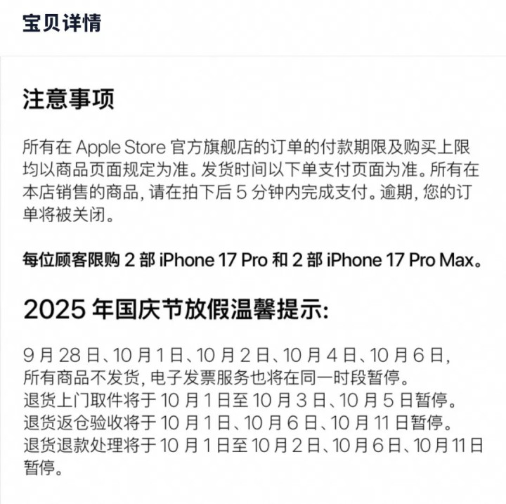 更让人懵圈的是:苹果突然宣布国庆黄金周多日暂停发货,连电子发票都停了。9 月 28 日、10 月 1 日、2 日、4 日、6 日直接拉闸,果粉们的心情也被“按下暂停键”。